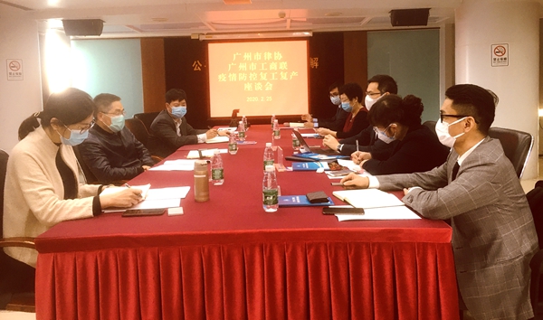 为了深入贯彻落实广州市人民政府《中小微企业十五条》措施与广州市司法局关于《中小微企业十五条》政策指引,2020年2月25日下午,赛马在线直播(以下简称“市律协”)与广州市工商业联合会(以下简称“市工商联”)在市工商联会议室举行专题座谈会。市律协副会长官选芸、黄山,秘书长朱宝莲,对外合作与交流工作委员会主任谭日兴,副主任王瀚出席会议。市工商联副主席陈立,广州市民营企业投诉中心主任郑雷晟,副主任贺辰等热情接待了我会一行并陪同座谈。