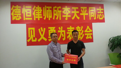 德恒广州分所在得知了李天平见义勇为的事迹以后,向北京总所进行了通报。王丽主任深表感动,马上拨出专款进行表彰,并号召全体德恒人向其学习。德恒广州分所也专门召开了表彰会,充分肯定李天平的义举。会上德恒广州分所的吴国权主任还向李天平颁发了分所及总所的专项奖金。