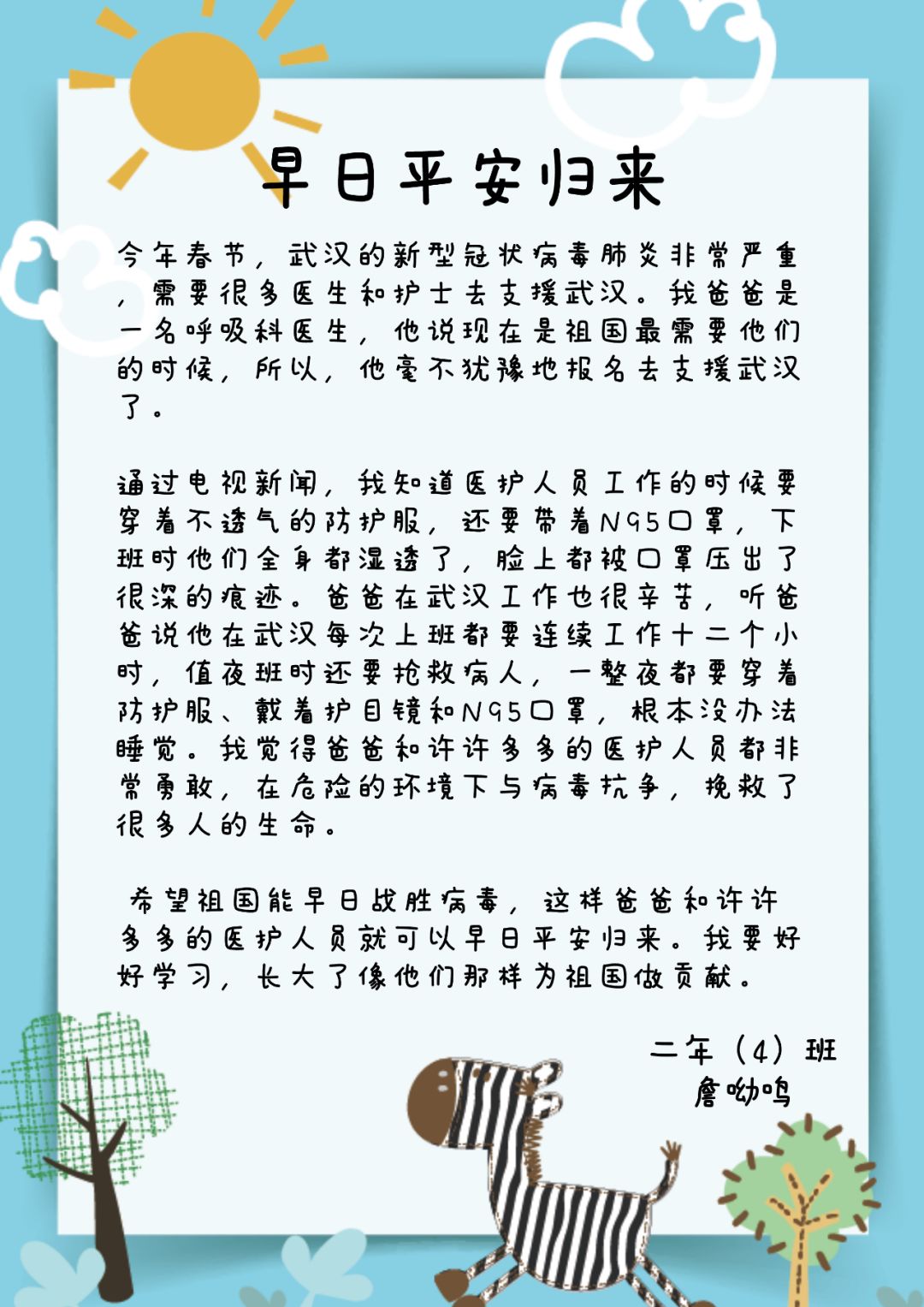 大女儿詹呦鸣的作文《早日平安归来》