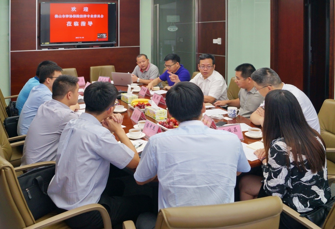 2017年6月16日上午,佛山市律协保险法律专业委员会主任袁陈兵、副主任李来斌、委员李鸿辉、胡振国、蒋中杰、李智就、巫婉晶等一行7人来访本所。本所主任陈默,管委会成员林永青,监事王浩,高级合伙人李鸿鹄、周庆元等热情接待了来访嘉宾并开展业务交流分享活动。