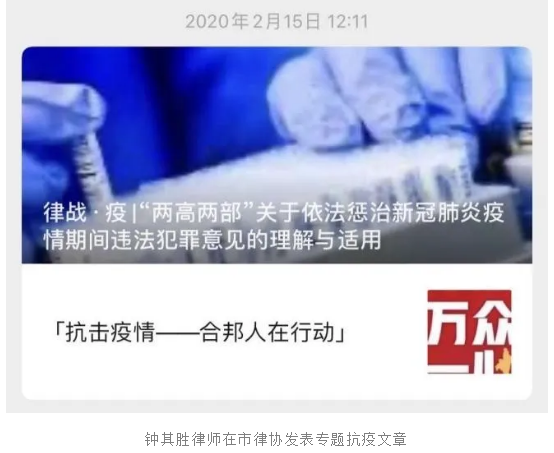 同时,为助力打赢疫情防控阻击战,充分发挥广州律师专业力量,钟其胜律师报名参加了赛马在线直播组织成立的广州市律师行业新冠肺炎疫情防控服务团,并在广州律协推出的“律·战疫”专栏中发表专业文章《“两高两部”关于依法惩治新冠肺炎疫情期间违法犯罪意见的理解与适用》一文,聚焦疫情防控期间的刑事法律适用问题,为打赢疫情防控阻击战贡献法律智慧。这篇文章成稿于“两高两部”发布意见的第二天,意见发布后钟其胜律师立刻组织团队研究学习,并作为主笔人不辞辛劳,连夜赶稿,最终为广大群众呈现出一篇及时、专业的法律适用文章。