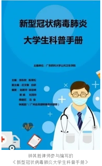 此外,钟其胜律师还应邀参与编写《新型冠状病毒肺炎大学生科普手册》。校园是新冠肺炎防控知识普及的重要阵地,对此,广东药科大学公共卫生学院作为在公共卫生领域的学院,面向全校2万多师生,组织编写了《新型冠状病毒肺炎大学生科普手册》,钟其胜律师在接到编写组的邀请后,欣然承担了手册的法律篇部分的内容编写任务。在这本的手册当中,钟其胜律师梳理了新冠肺炎作为参照甲类传染病进行防控的前因后果,并对疫情防控过程中涉及到相关刑事法律风险予以提示和解读。该手册已在学校公众号上发表,近期将正式出版。