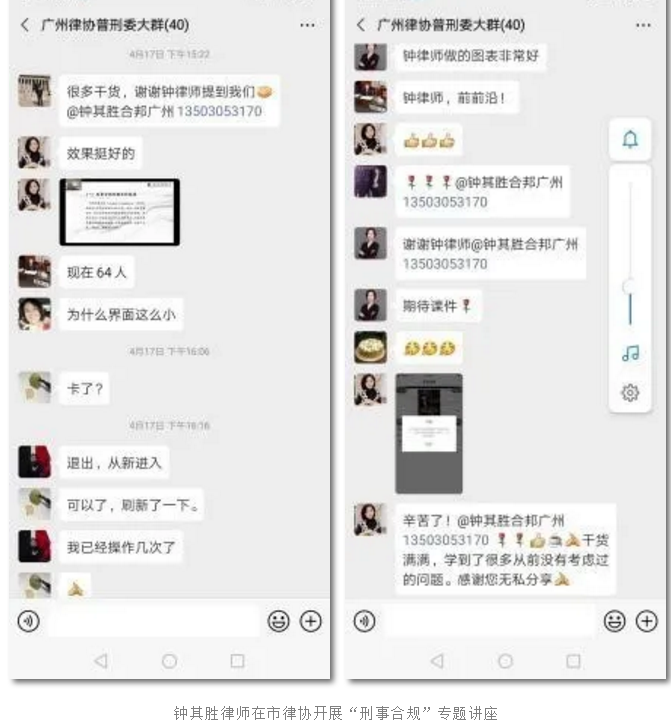 最后,因为疫情影响,许多律师同仁无法正常开展工作,转向学习修炼、提升内功,以为复工做好准备。在这样的背景下,广州市律协组织了一系列专业培训,钟其胜律师亦在2020年4月17日为广大律师同仁奉献了一场精彩的业务讲座直播,讲座主题为企业刑事危机应对,尤其是针对企业在疫情爆发的大背景下暴露出来的刑事危机应对,钟其胜律师给出了切实有效的应对建议,很多听课的同行表示干货满满受益良多,不少企业经营者也表示从这场讲座获益。