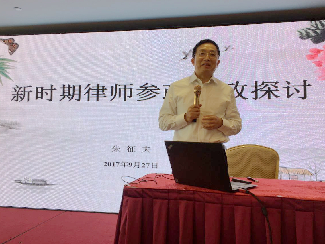 2017年9月27日下午,由广东省律协主办、广州市律协协办的“全省律师参政议政专题培训讲座”在广州召开。全国律协副会长、全国政协委员朱征夫担任主讲嘉宾,广州市律协副会长黄建水、省律协律师参政议政促进工委会主任杨小菁、市律协参政议政联络委主任陈茵明以及省律协律师参政议政促进工委会部分委员、各市律协分管律师参政议政工作的相关委员会负责人共60人参加讲座。省律协监事李庆华列席讲座。讲座由省律协参政议政工委会杨小菁主任主持。
