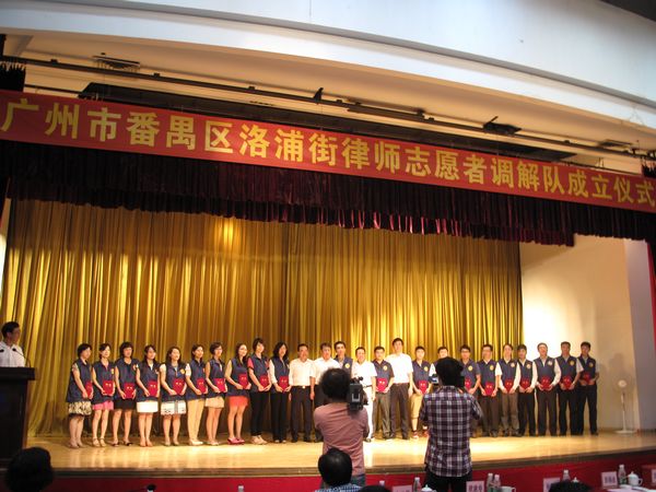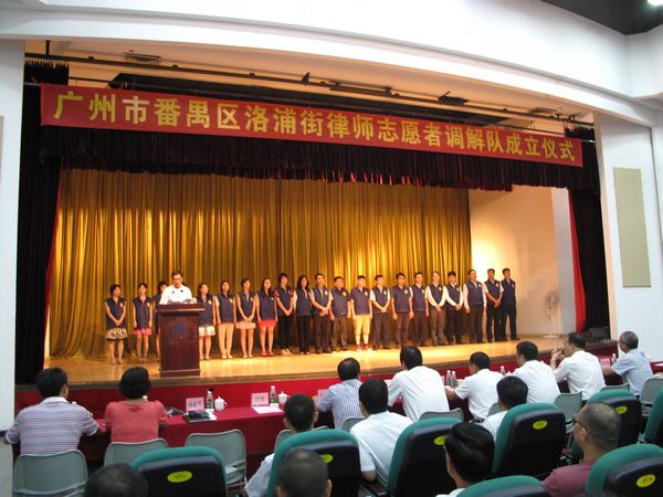 2013925上午,广州市番禺区洛浦街隆重举行该街律师志愿者调解队成立仪式,广州市司法局、市律师协会和番禺区相关领导出席了仪式,番禺区各镇街司法所负责人和相关律师事务所负责人到会参加。