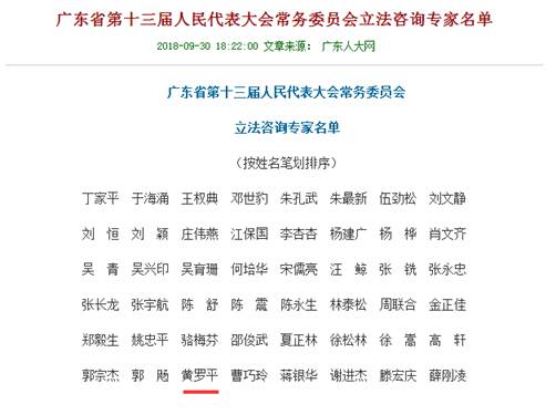 为扩大社会人士有序参与人大立法工作,充分发挥社会力量的作用,进一步提高人大立法工作质量和水平,广东省第十三届人民代表大会常务委员会聘任了48名立法咨询专家。广东连越律师事务所合伙人黄罗平律师被省十三届人大常委会聘任为立法咨询专家。