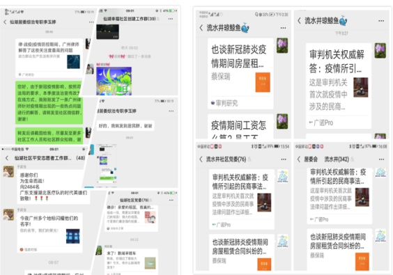 律师抗“疫”战队以新媒体普法为突破口,就涉及疫情防控期间企业经营、医药卫生、劳动用工、合同纠纷等相关法律问题的意见和建议,通过“抖音”平台、微信公众号、微博等形式予以发布。广东盈隆律师事务所就各企业家最关心的劳动用工、复产融资、企业家刑事风险三大问题,特开设三场专题免费公益直播,编撰企业复工复产专刊30余篇,为疫情防控相关事务提供专业的法律支持。广东君信律师事务所团队参与编写《广州市国资委监督企业依法有序复工复产常见法律风险防控参考指引》,为企业有序复工复产提供法律指引方案。农林街社区法律顾问团队整理《疫情防控期间企业复工指南(广东版)》,为我省用工单位和公民个人提供有益的参考和借鉴。越秀区社区法律顾问杨满玉律师为解答企业和劳动者各种疑难问题,录制六期《战“疫”说法》节目,发布在今日头条、抖音“广州普法”平台,目前播放率已经超过2000万,第三至六期作为工会干部学习手册,印发全市各区工会干部学习。