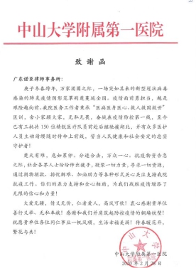 ▲中山大学附属第一医院向广东诺臣律师事务所致以感谢。