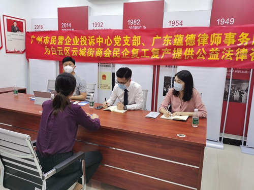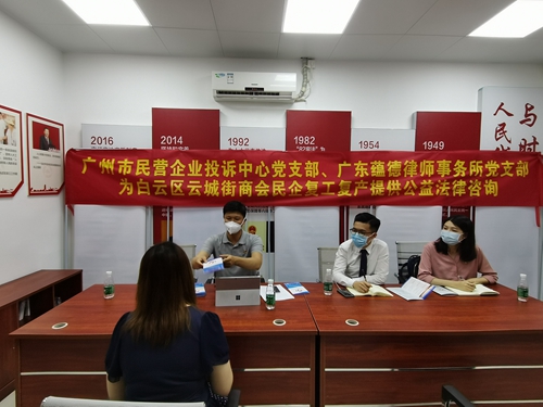 2020年5月22日下午,广州市民营企业投诉中心党支部、广东蕴德律师事务所党支部携手走进白云区云城街汇创意园,与云城街商会党支部一同开展以”为民企复工复产送温暖”为主题的实践活动。