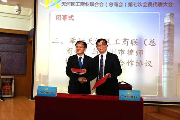 2016年9月6日下午,广州市天河区工商联合会(总商会)第七次会员代表大会在天河区政府隆重举行。会议由广州市天河区委书记林道平、市统战部副部长张镜平等领导主持,多家企事业单位代表参加,市律协邢益强会长、官选芸副会长、林泰松外联委主任等律协领导列席了会议。会议的主要议程为两项,一为商会领导换届选举,二为与市律协签订《战略合作协议》。广州市天河区工商联合会(总商会)表示,与市律协结成战略合作伙伴将更好地促进社会组织的法制建设健康、有序发展。市律协表示,与广州市天河区工商联合会(总商会)结成战略合作伙伴将更好得帮助律师队伍走出去,更深入社会组织了解需求、提出对策。双方均表示将以《战略合作协议》为基石,向上搭建多元化、多层次、多服务的合作平台。同时,双方之后将进一步洽谈的具体合作内容,定期互访会谈并开展具体的业务交流活动。